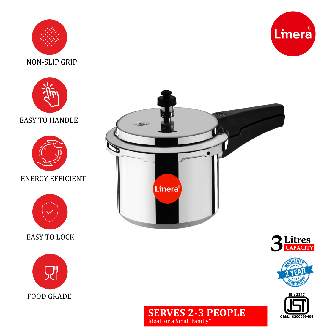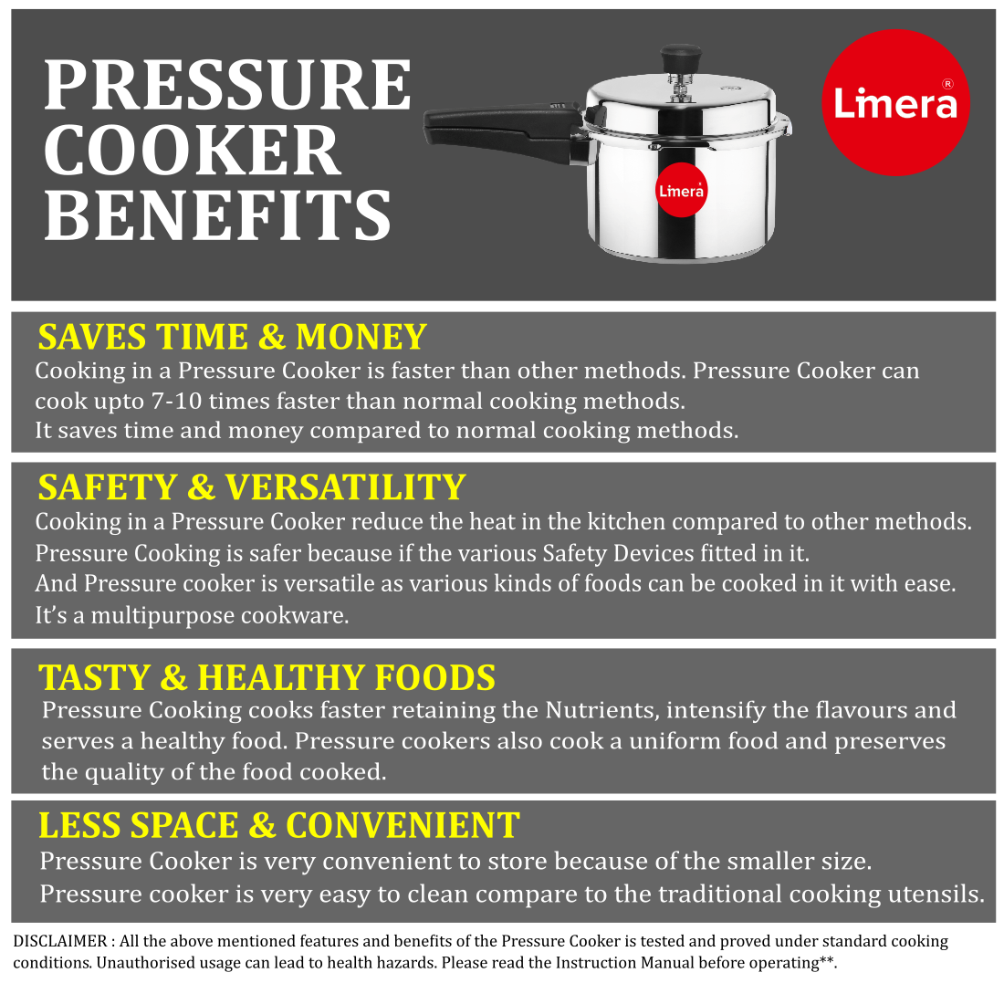 Checkout the awesome collection of Premium Quality culinary products from the House of Limera. Limera Ixora is a Premium Quality Pressure Cooker made from Virgin Aluminium material. Virgin Aluminium makes this Pressure Cooker sturdy and strong and provides longer life to the product. This Pressure Cooker is Gas and Induction compatible. This Cooker enables you to cook delicious dishes in a smarter way with higher energy efficiency and safety.